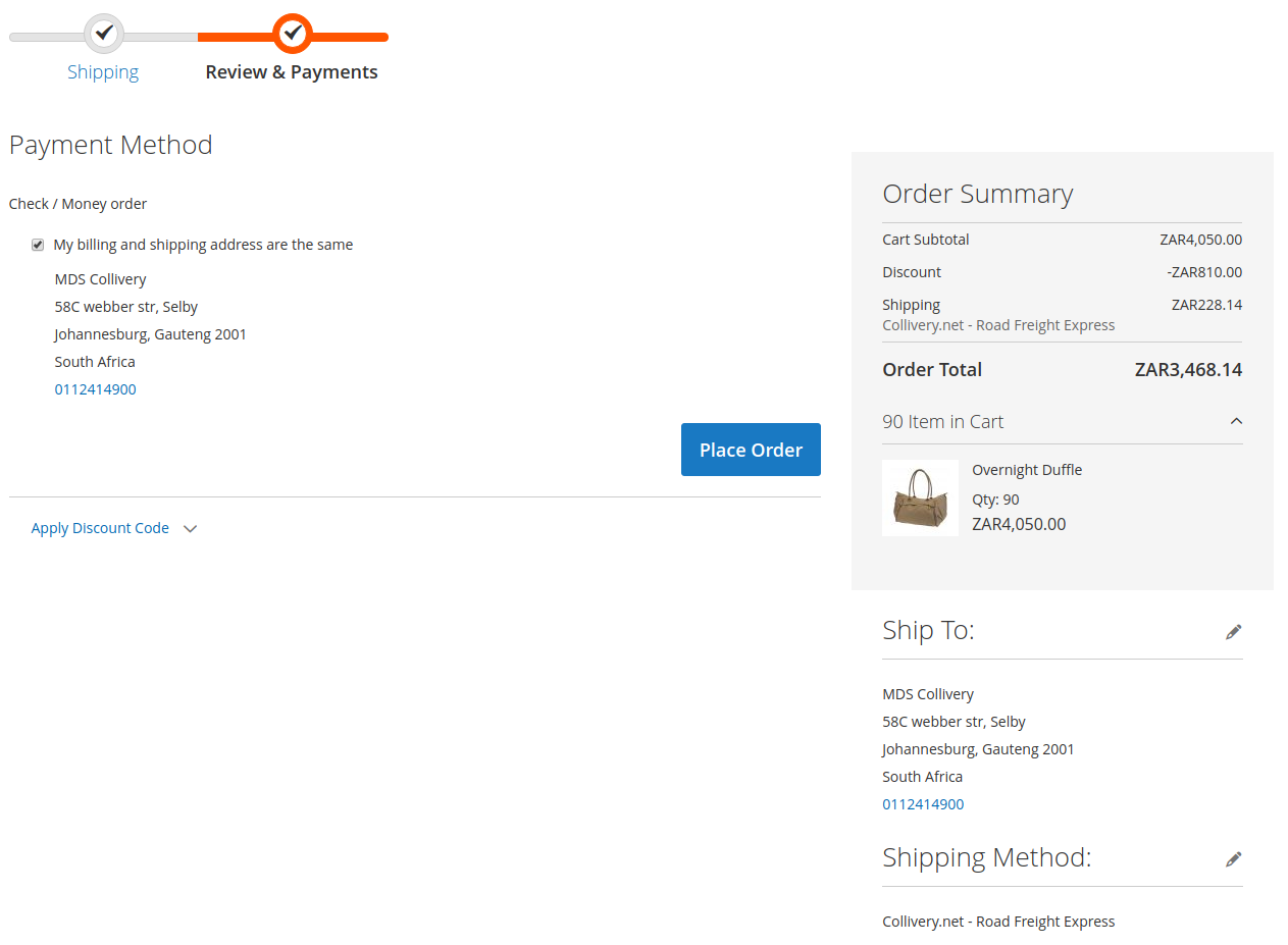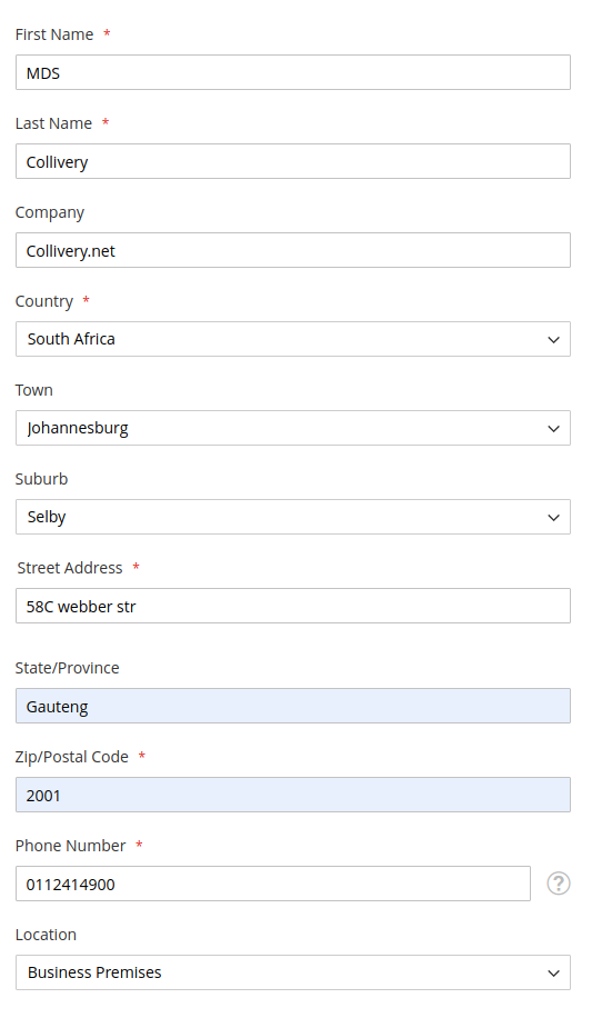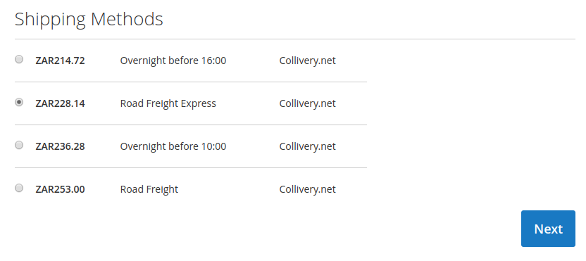 This module uses the MDS Collivery API to fetch pricing information for the current checkout. It uses your default address set on your Collivery Account as the 'From' address, and uses the clients information filled out on the checkout page as the 'To' Address.