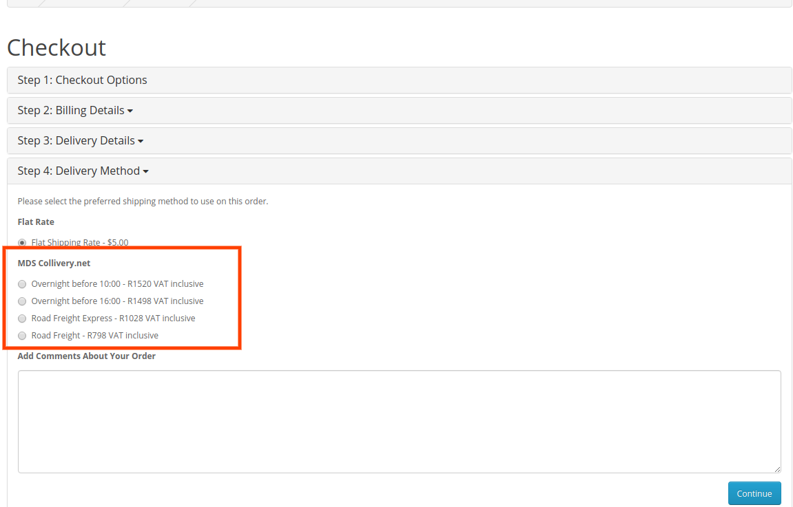 The shopper will check out as per usual. When selecting the delivery method the different services we offer will be displayed with your markup/handling fee already calculated if you specified one as well the display title that was configured in the admin section.