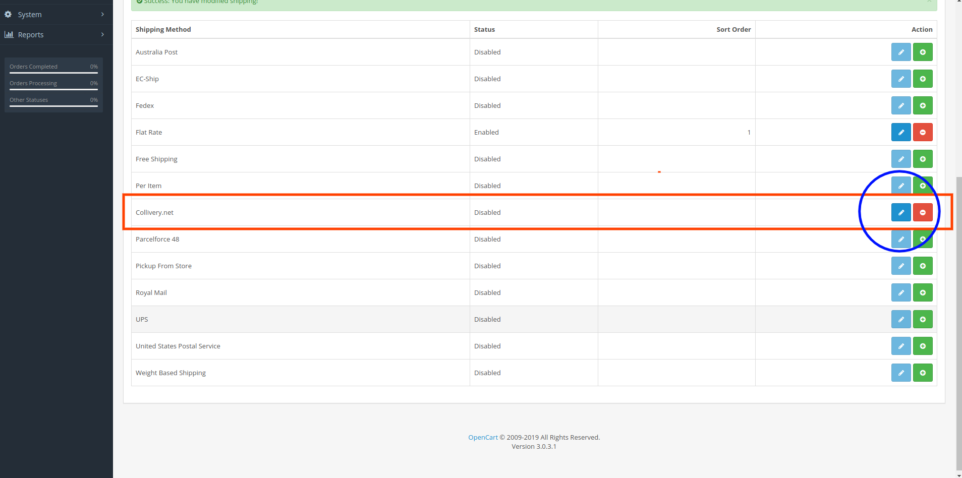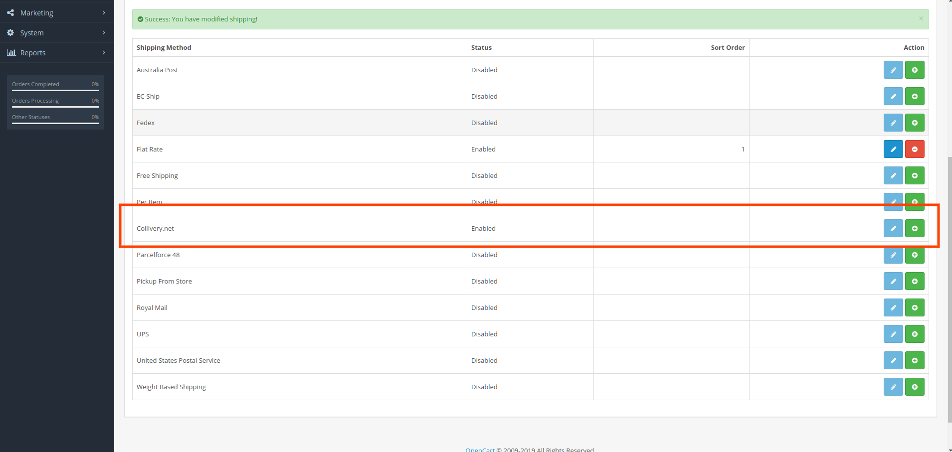To configure navigate to "Shipping" in your admin back office, search for the Collivery.net shipping extension and then click on "Edit".