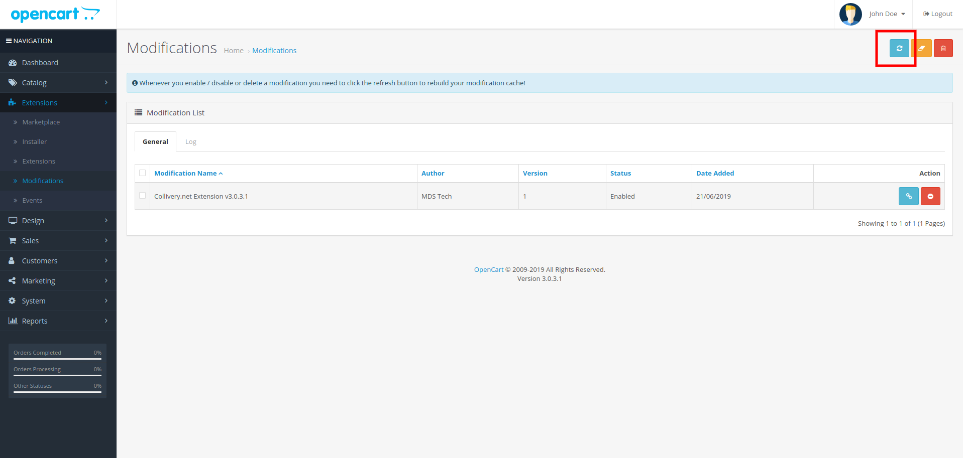 Next navigate to "Extensions" menu select "Modifications" and refresh mods. Please note that this will reload ALL the ocmod files that are listed.