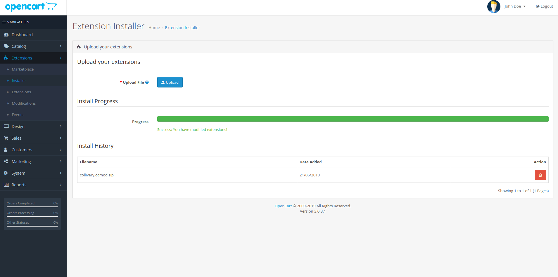 Now, go to your browser and navigate to your OpenCart site administration backend. In the "Extensions" menu select "Installer" and upload "collivery.ocmod.zip".